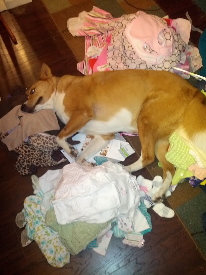But we were happy to be home! The dogs were happy, too. Lily was curious enough to give a good lick to Emma’s head. Lennon was (and still is) very interested whenever Emma makes a noise. We are fine to have them sniff and lick her, but we are trying to manage Lennon’s interest level by giving her billions of toys to keep her busy.