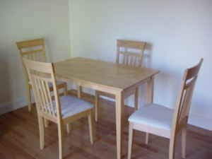 This adorable, natural maple-colored dining room table with 4 chairs for $75 total.
